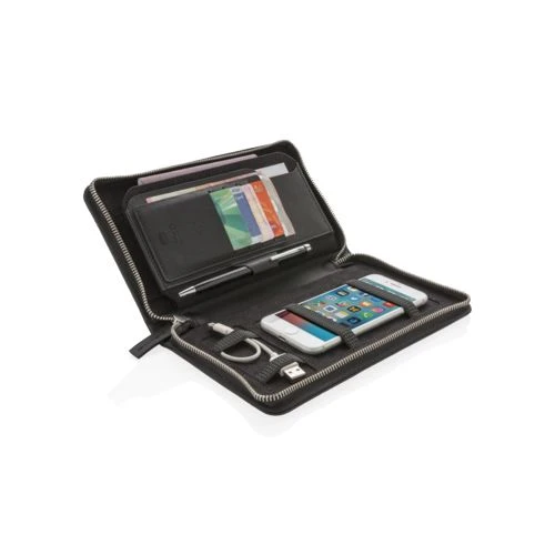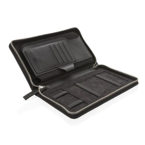Portefeuille de voyage de luxe avec protection anti RFID. Il protègera tous vos documents de voyage comme votre passeport, vos billets et votre argent. Avec 4 emplacements à cartes et passant à stylo. La poche sur le côté droit est prévue pour votre téléphone portable.