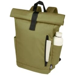 Sac à dos pratique, robuste et déperlant en polyester recyclé GRS doté d’un grand compartiment intérieur avec un compartiment pour ordinateur portable de 15,6″, d’une poche frontale zippée et de 2 poches latérales. Dos rembourré, bretelles réglables et rembourrées, boucle de transport et fermeture pratique enroulable avec système de déclic sur le dessus. Le sac idéal pour un usage quotidien, avec une empreinte écologique minimale.