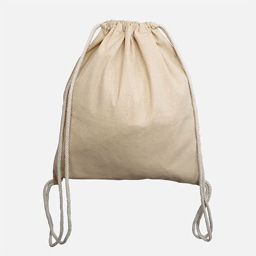 SAC À DOS EN COTON RECYCLE 150 G ECRU AVEC 2 CORDELETTES. RESISTANCE AU POIDS JUSQU’A 2KG