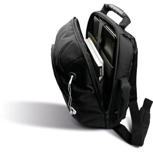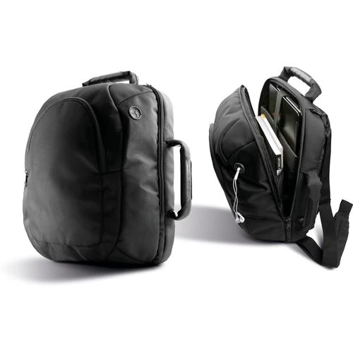 Sac ordinateur portable / porte-documents à double usage pouvant se transformer en sac à dos. Polyester recyclé 1680D, Bretelles cachées, empiècement dos matelassé, attache fixation trolley au dos, bandoulière ajustable et amovible avec confort d’épaule, poignées renforcées et matelassées, poche frontale multifonctions, compartiment central entièrement matelassé pour ordinateur jusqu’à 15″ et documents, ouverture pour écouteurs, porte-clefs.