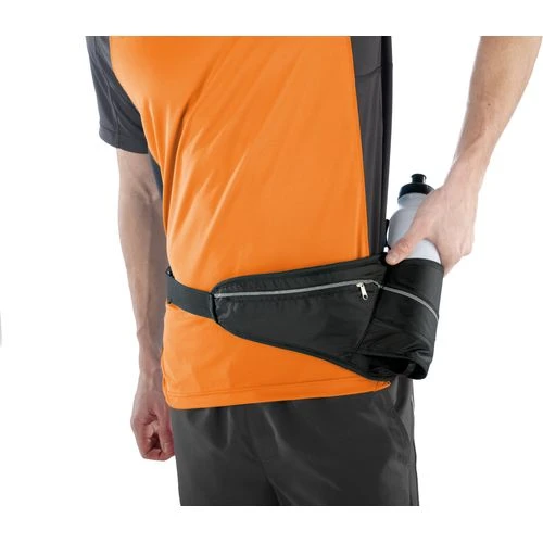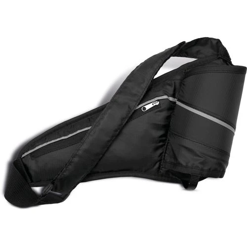 Sac de ceinture porte-gourde en polyester ripstop, idéal pour toute activité sportive ou de plein air. Poche au dos, compartiment bouteille avec stopper élastique, bande réfléchissante.