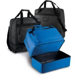 Sac de sport en polyester 600D, 60 litres. Base rigide détachable en polypropylène avec pieds en plastique. Poche devant zippée pour faciliter la personnalisation, porte-carte, lanière d’épaule détachable avec coussinet en silicone. Base rigide livrée avec le sac.