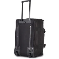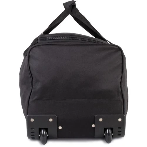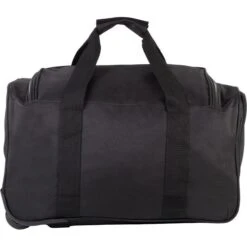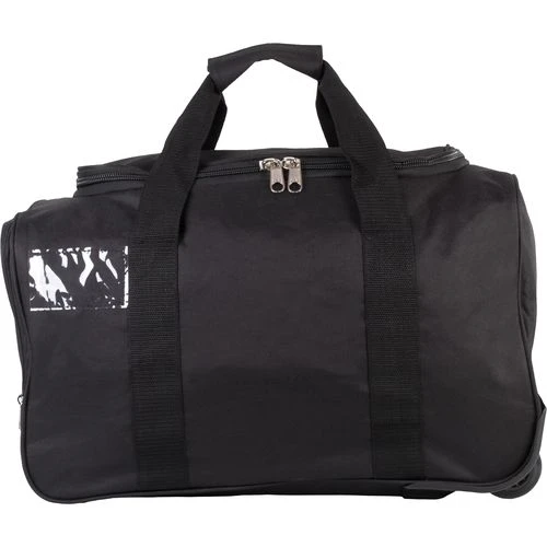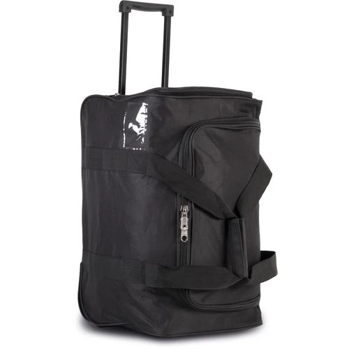 Sac de sport / sports co avec système trolley, de taille moyenne (55 cm), en polyester 600D. 1 poche côté zippée pour loger 1 paire de chaussures, grande ouverture avec large zip sur le dessus, porte-étiquette pour identification, poignées sangle renforcées avec lanières de 5 cm tout autour du sac.