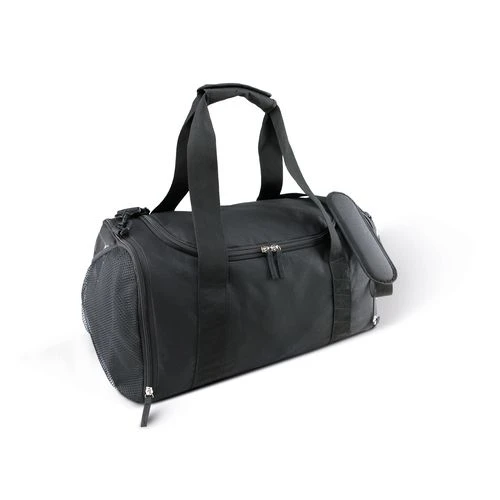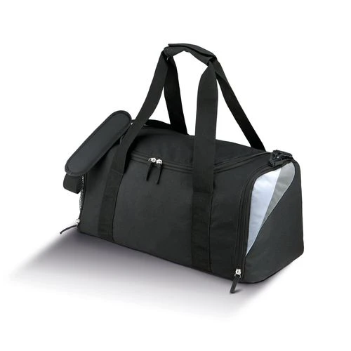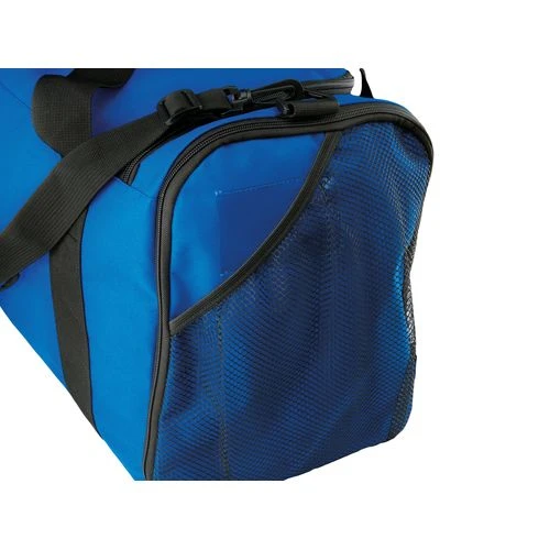 Sac de sport/ sports collectifs grande taille : 61 cm en polyester 600D, 2 poches côté : 1 pour rangement chaussures, 1 poche côté extérieure en filet. Lanière d’épaule amovible et ajustable.