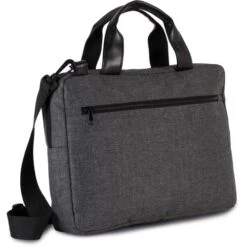 Sac porte-document / ordinateur en polyester 600D. Compartiment matelassé pour loger un ordinateur jusqu’à 13 pouces, poche devant zippée, poignées de couleur contrastée. Lanière d’épaule amovible.