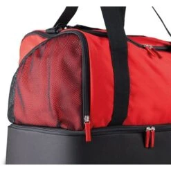 Sac pour sport collectif en polyester 600D avec base rigide. Diverses ouvertures zippées, lanière d’épaule renforcée et amovible, grandes poches côté dont une en filet.